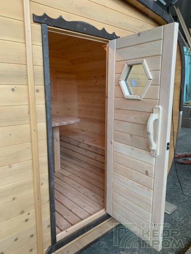 Квадро-овальная банька длиной 4 метра и шириной 2,35 метра. Отличается, в первую очередь, оригинальным внешним видом. Внутреннее оснащение бани - это просторная парная и комната отдыха, в которых имеется всё: печь в комплекте с дымоходом, удобные полки, трапики, стол, сидения, окна, и даже камни для печи, докупать ничего не нужно.