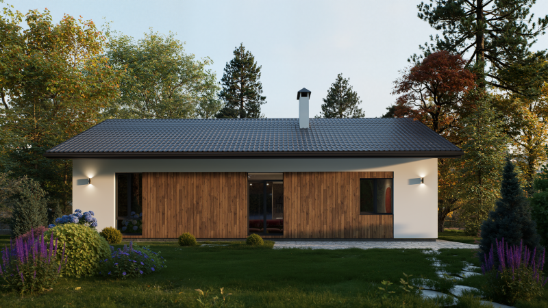 Одноэтажный дом с двускатной крышей, представляет собой классический вариант загородного дома. Двускатная крыша гармонично сочетается с окружающим ландшафтом, а деревянные вставки из лиственницы придают дому эстетичный вид.