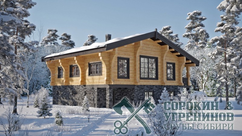 Индивидуальный дом рубленый из лафета кедра сечением 220х350мм, площадь дома 116м2. Размер сруба 12х14 метров. Проект дома планировался с цокольным этажом. Внешний вид дома выполнен в скандинавском стиле с живой кровлей. Дом имеет большой холл, совмещенный с кухней и гостиной, две спальни и санузел, терраса. Отличный дом для любителей норвежского зодчества.
