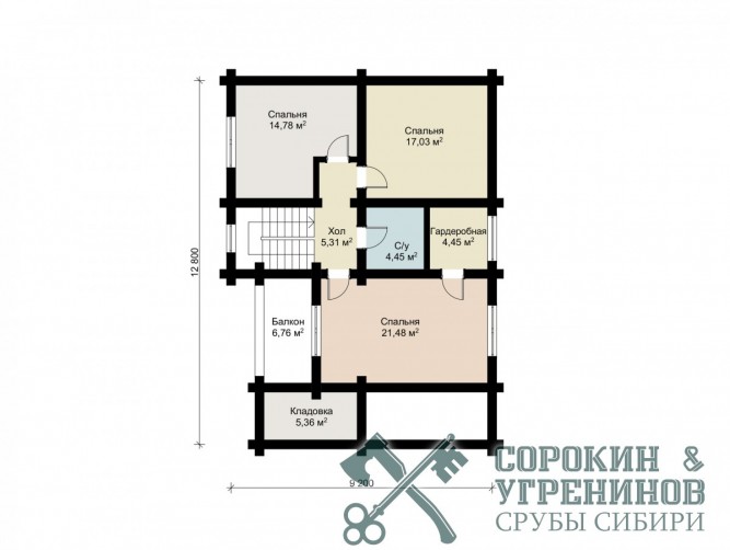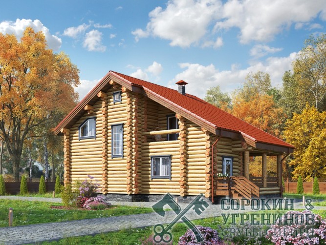 Проект двухэтажного дома площадью 180м2, из бревна диаметром 280мм. Размер сруба 910х12 метров. Первый этаж имеет террасу, лестничный холл, гостиную, кухню, санузел и спальню. На втром этаже три спальные комнаты, холл, санузел, гардеробная, балкон. Дом построен в Северном Казахстане в городе Гараганда в 2012 году.