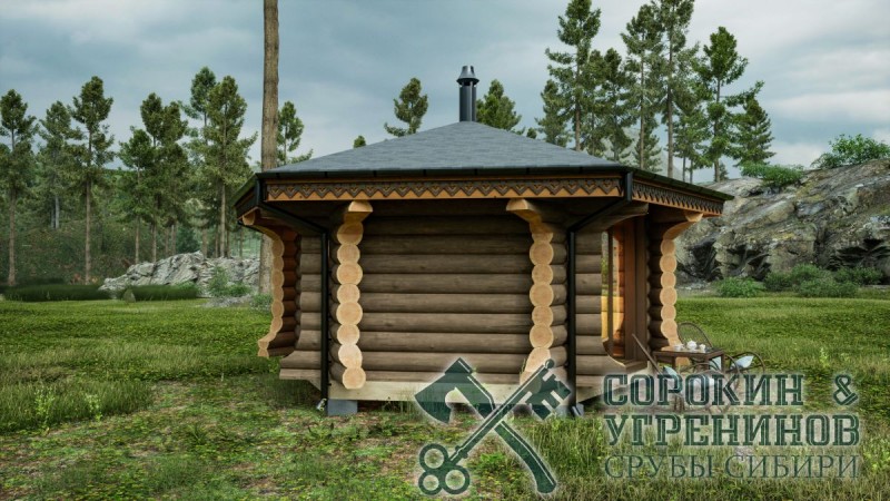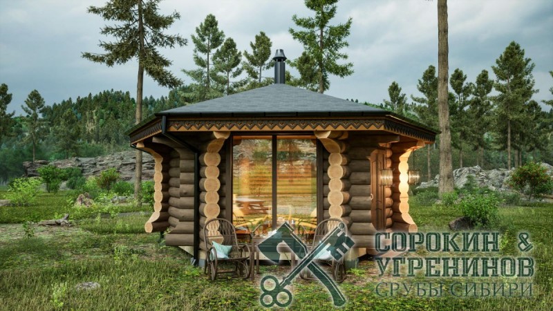 ХанБаня. Новый наш проект срубовой бани рубленый из бревна по форме Алтайского Аила, площадью 22м2. Сруб Аил-бани рубленый из бревна кедра диаметром 280мм, его размер по осям 6 на 6 метров. Объём бревна в срубе 20м3. Рубка сруба в классическом русском стиле с выделением карнизных балок. Большие панорамные окна в парной и комнате отдыха, придают невероятно стильный колорит бане, и отличный обзор изнутри. Отличительная особенность такого сруба шестиугольная форма в виде Алтайского дома Аила. Нет лишних помещений, только парная 11м2 и комната отдыха 11м2, и в ней же можно установить душевую кабину, хотя помыться можно и в парной. Обращаем Ваше внимание, данный проект мы решили показать на банном фестивале в Суздале, августе 2024. Сейчас производится наполнение, изобретена эксклюзивная печь Химера от ТМФ специально для фестивали и этой бани.