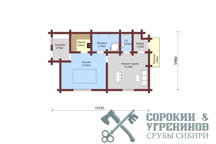 Рубленая баня из лафета кедра, площадью 52м2. Размер сруба 5,9х10,2 метров по осям. Планировка бани, парная, душевая, комната отдыха, бассейн, топочная, терраса. Сруб рубленый в норвежский замок. Объем лафета в срубе 53м3.