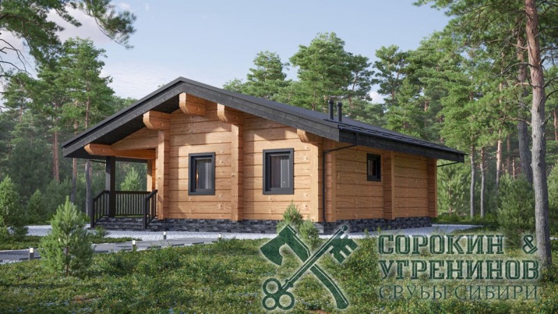 Проект загородного дома с баней внутри, рубленый из лафета сечением 250х400мм. Общая площадь дома 75м2. Одноэтажный дом имеет одну спальную комнату, есть просторная гостиная с кухней, парную с печью на дровах, душевая, и санузел, прихожая с гардеробом, и крыльцо.